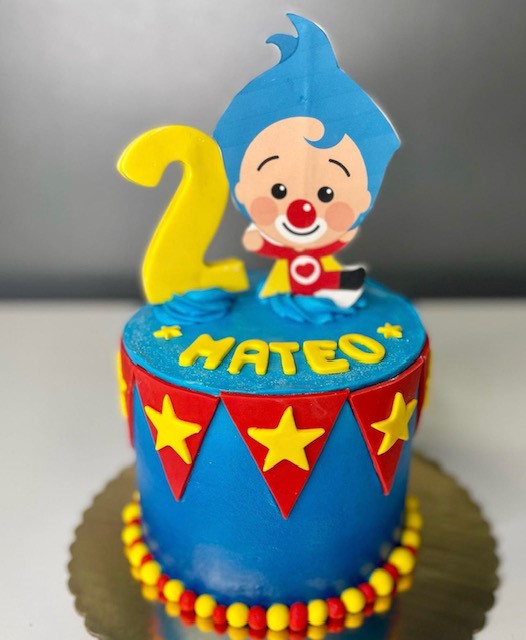Buttercream decorated cake. Sugar print Plim Plim clown. Details in fondant.